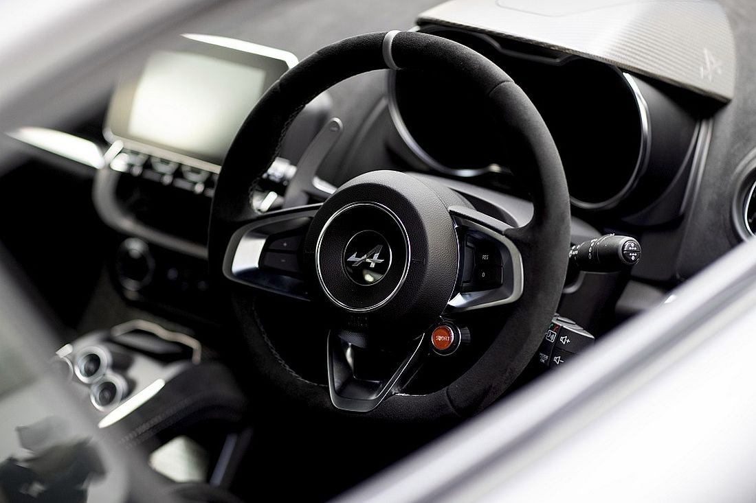El habitáculo presenta piezas de carbono hechas a mano en Enstone, en el mismo taller y con los mismos materiales utilizados para la producción de dos coches de Fórmula 1™: la visera, la consola central y el salpicadero le confieren una personalidad única.