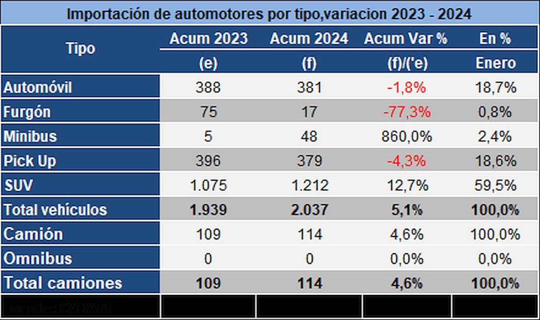 En el pasado mes de enero, se registró la importación de 2.037 vehículos livianos a Paraguay, lo que representa un aumento de 5,1%, respecto al año 2023, cuando fueron importados 1.939 unidades.