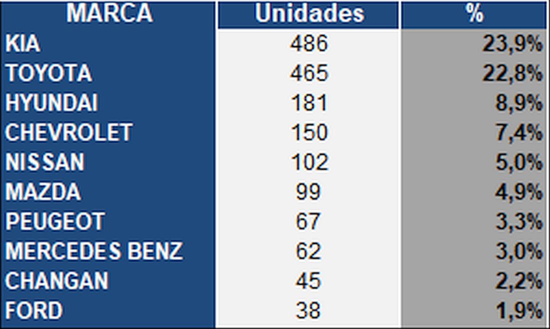 En cuanto a marcas, al mes de enero de 2024, con 23,9% Kia encabezó la lista con mayor volumen de importación de vehículos livianos por delante de Toyota (22,8%) y Hyundai (8,9%)