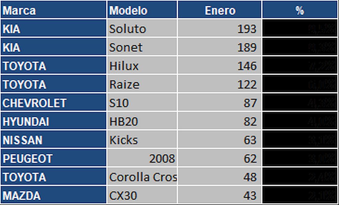 En el primer lugar de los vehículos livianos más importados, Kia Soluto se posicionó con 9,5% de participación, seguido por Kia Sonet S10 (9,3%) y Toyota Hilux (7,2%)