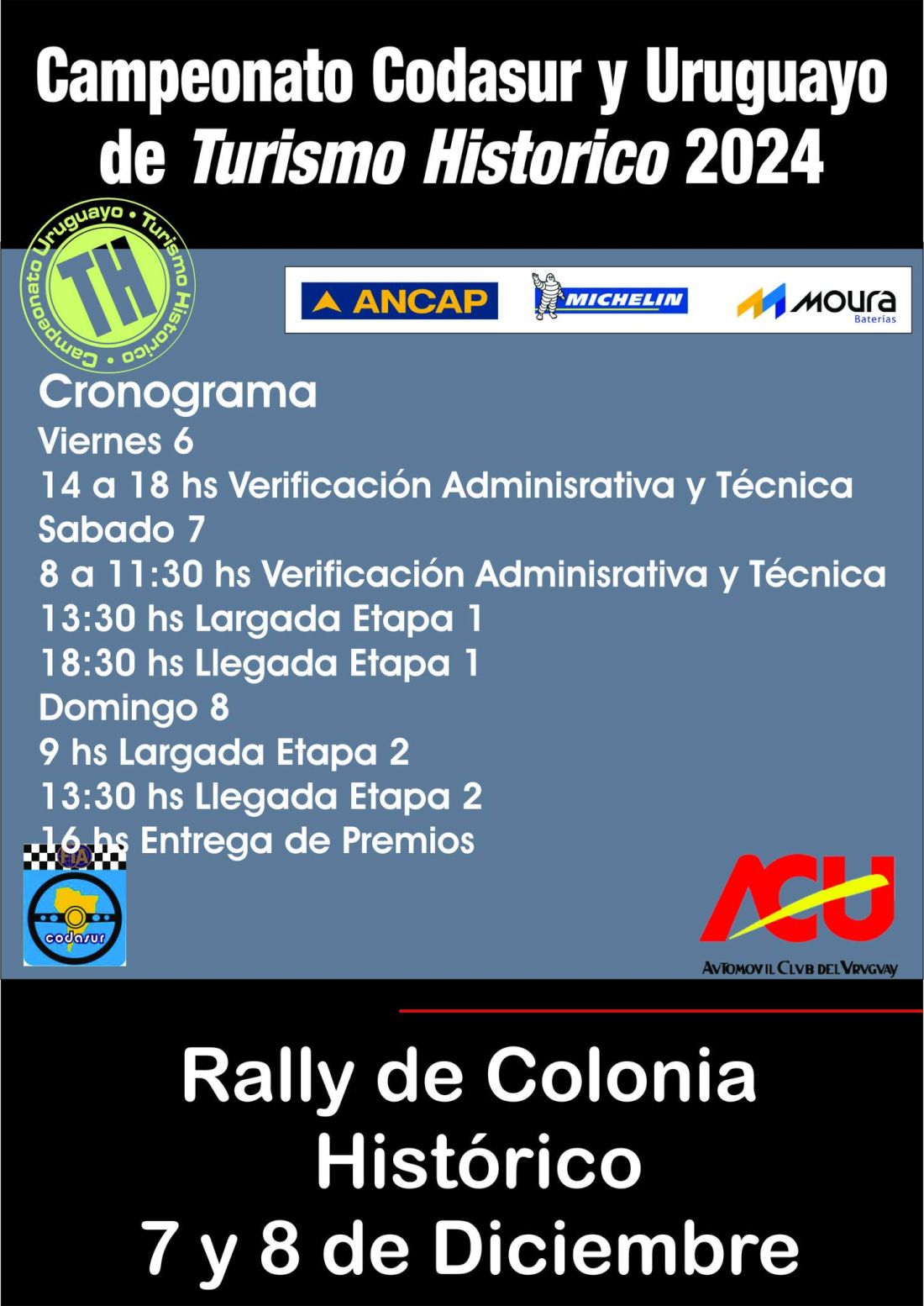 El Rally de Colonia Histórico de Uruguay tendrá este viernes sus verificaciones administrativas, técnicas y de seguridad y la largada de su primera Etapa será el sábado 7 a las 13:30 y se prevé su final para las 19:30.