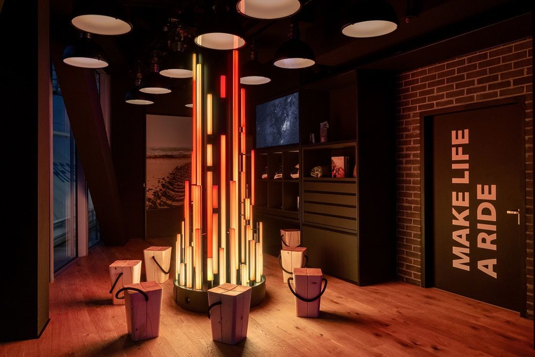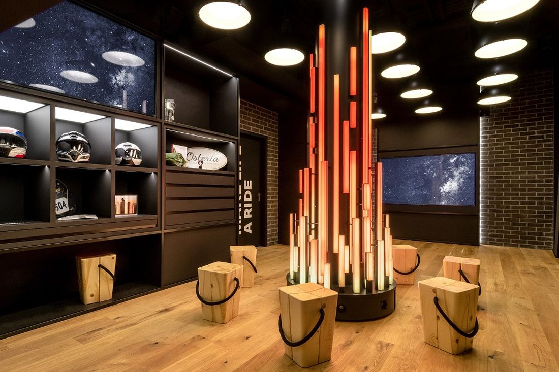 Elementos como el sonido y la luz se combinan perfectamente con la impresión espacial y las fases de entrenamiento. En el centro de la sala, la fogata creada a partir de paneles de fibra óptica en forma de escultura de luz simboliza la reunión de motociclistas, como un lugar para el diálogo y la comunicación y como un símbolo de la conexión con clientes y fanáticos a través de la marca BMW Motorrad.