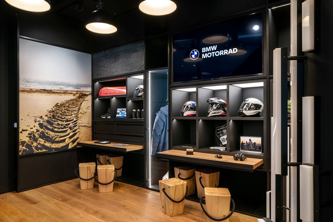 Los estímulos acústicos y visuales apropiados, la iluminación atmosférica de la escultura de luz y los materiales naturales seleccionados utilizados para el mobiliario aseguran una atmósfera auténtica que transmite el aire libre y la experiencia de primera mano. Enmarcado por tres estantes múltiples a la altura del techo, con puntos focales temáticos específicos del cliente, el resultado es un espacio experiencial que representa de manera memorable todas las facetas de la marca BMW Motorrad y despierta emociones y creatividad en los visitantes.