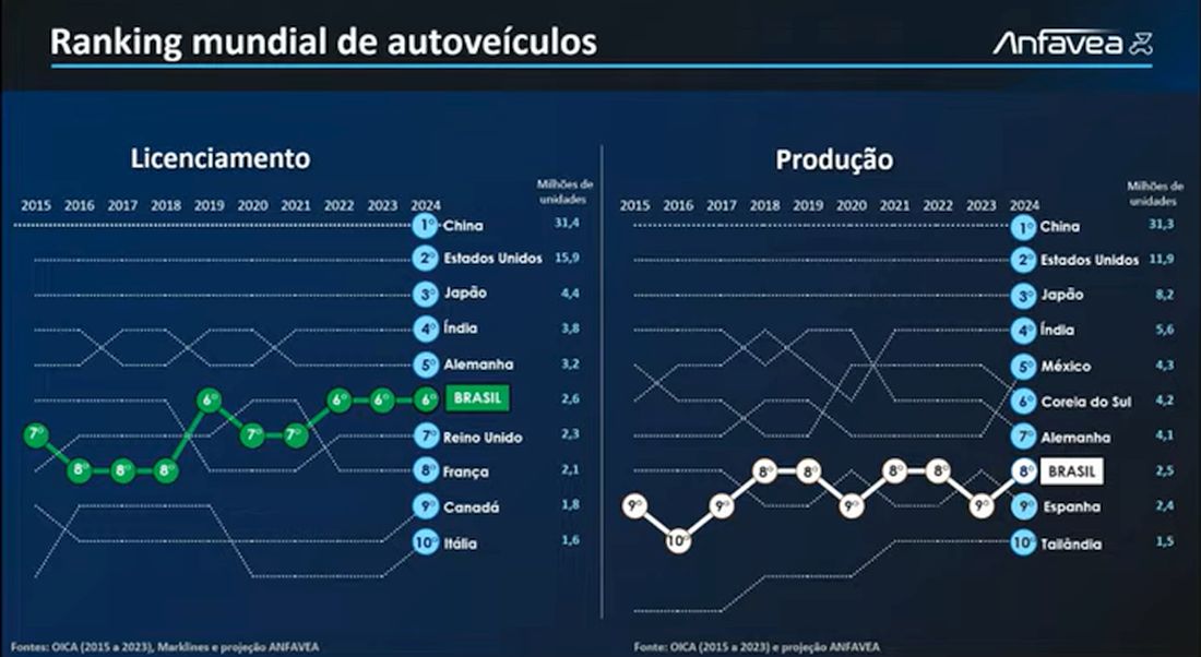 El ascenso del país y los números para 2024 fueron publicados este martes por Anfavea. Márcio de Lima Leite, presidente de la entidad, destacó, sin embargo, que la producción podría ser aún mayor si las exportaciones tuvieran un mejor desempeño y, al mismo tiempo, las importaciones no “robaran” a los consumidores los productos nacionales.