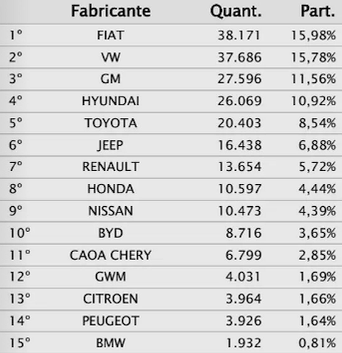 En los primeros meses de 2024 hubo diferencia a favor de GM, que tenía 27,6 mil unidades registradas y sólo 1,5 mil licencias. En el mismo período del año pasado, el fabricante de automóviles estadounidense ocupó el primer lugar del ranking con más de 37.000 coches vendidos, 5,1 mil más que Fiat, que entonces ocupaba el segundo lugar.