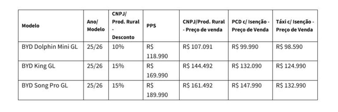 El ejecutivo incluso mostró tablas con los descuentos que ofrecerá la marca china, que van del 10% al 15% para productores rurales ( ver tabla a continuación ) y con tarifas aún mayores para personas con discapacidad y taxistas. En estos dos últimos casos, el Dolphin Mini costará menos de R$ 100.000.