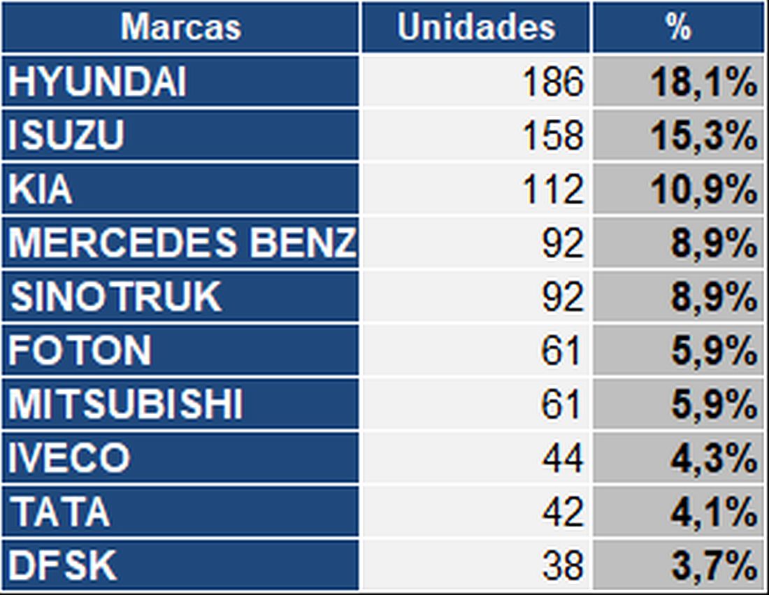 El primer puesto de los modelos de camiones con mayor porcentaje de participación lo tiene Hyundai con su modelo H100 (14,1%). Seguido por Kia K2700 (10,9%) e Isuzu QLR77L (6,3%).