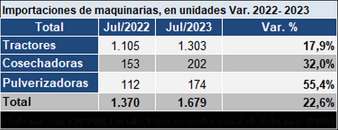 Al cierre del mes de julio, se registró la importación de 1.679 maquinarias agrícolas, un 22,6% más respecto al mismo periodo del año 2022. Los tractores tuvieron variaciones positivas de 17,9%, al igual que las cosechadoras (32%) y las pulverizadoras (55,4%).