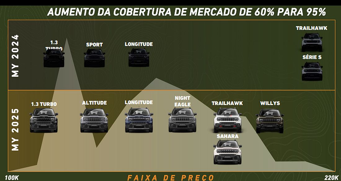 Los consumidores ahora tienen nada menos que seis versiones disponibles, desde el nuevo básico 1.3 Turbo con un precio de R$ 115.990,00 hasta el propio Trailhawk, que ahora cuesta R$ 173.990,00, R$ 14 mil menos que en línea en 2024, todas con 5 años de garantía. La serie especial Willys también se ofrecerá de forma temporal, limitada a 500 unidades y vendida hasta finales de 2024.