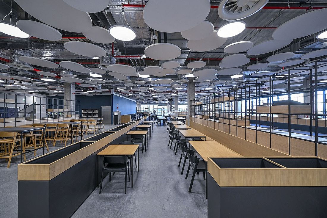 El restaurante multifuncional de los colaboradores también se puede utilizar para reuniones fuera de las horas de comida. Éste también se encuentra en la planta baja, junto con el mercado central y el centro de salud. En el área de la planta baja del Centro de Comunicaciones también se encuentra un laboratorio vanguardista en un espacio de 1,300 m2. Los colegas del laboratorio serán responsables de la calidad Premium de los colores de los modelos NEUE KLASSE. El Centro de Salud de la Planta, el cual tiene un área de 700 m2, operará en el edificio y se hará cargo de la salud y el bienestar de los colegas, mientras que también llevará a cabo campañas de prevención y chequeos. La planta alta está ocupada por oficinas.