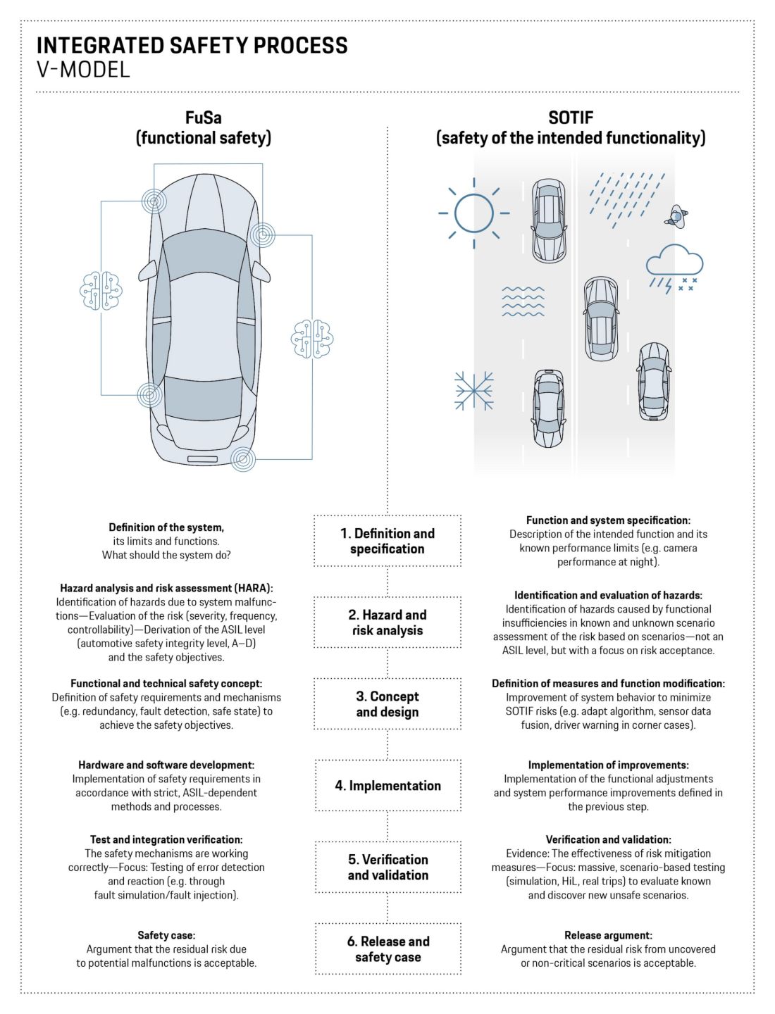 A pesar de la similitud, existen diferencias en los pasos del proceso entre FuSa y SOTIF. Generalmente se prefiere un enfoque iterativo con análisis exploratorios y métodos de prueba para lograr SOTIF (ver recuadro en la página 38). “Los desarrolladores especifican, prueban y revisan el diseño del sistema hasta alcanzar un riesgo residual aceptable”, informa Dennis Müller, Ingeniero de Desarrollo en Porsche Engineering. Porsche Engineering ofrece a sus clientes un portafolio de soluciones integral que incluye ambos métodos de seguridad—SOTIF y FuSa—para gestionar el complejo desarrollo y verificar y validar los sistemas de asistencia al conductor y las funciones de conducción autónoma.