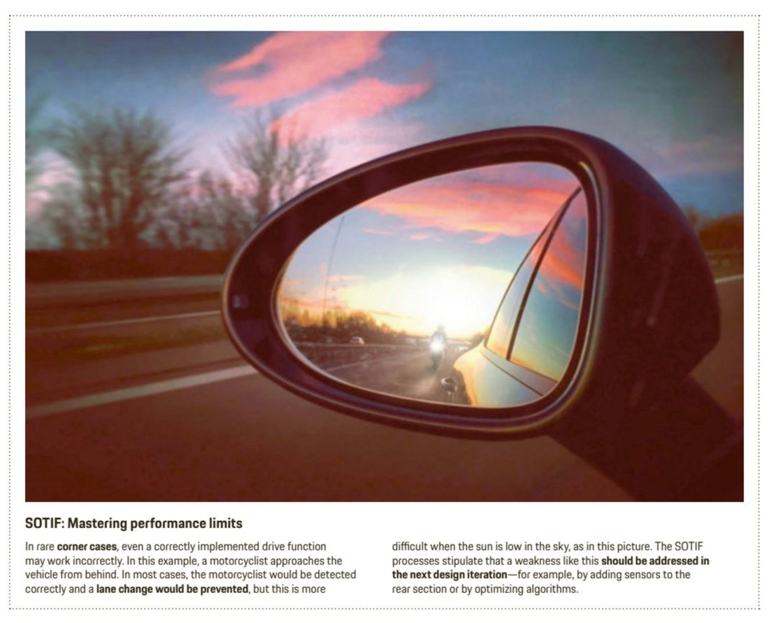 SOTIF entra en juego al dominar los límites de rendimiento para la conducción automatizada en autopista. Por ejemplo, la detección de vehículos debe diseñarse para que todos los demás vehículos alrededor o que se acercan, incluidas todas las motocicletas, sean detectados. Sin embargo, debido a los límites de rendimiento técnicamente inherentes de los sensores utilizados, el vehículo puede no detectar correctamente ciertas siluetas estrechas y trayectorias de aproximación bajo condiciones de luz o clima desfavorables. Aunque el hardware y el software funcionan perfectamente, esto podría hacer que la función inicie un cambio de carril que resulte en riesgo de colisión con una motocicleta que adelanta. En este caso, los procesos SOTIF estipulan que el diseño debe analizarse y validarse en todos los escenarios operativos y que las debilidades identificadas se corrijan con la siguiente iteración del diseño (actualización de especificación seguida de actualización de implementación). Por ejemplo, se podrían instalar cámaras adicionales y sensores lidar en la sección trasera o se podrían optimizar los algoritmos de fusión de sensores.