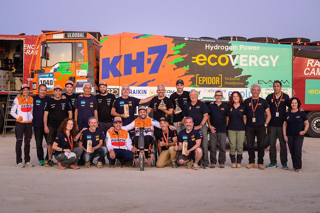 Jordi Juvanteny, José Luis Criado y Xavi Ribas han conseguido su segunda victoria consecutiva en la categoría Mission 1000, destinada a vehículos propulsados por energías alternativas. El trío del equipo KH-7 ECOVERGY llevó su MAN 6×6 propulsado por una mezcla de hidrógeno y HVO (aceite vegetal hidrotratado) hasta la meta de Shubaytah en primer lugar, una posición que habían logrado desde la primera etapa y que no habían liberado hasta la fin. Para ellos, es un merecido premio a su visión innovadora y al gran desarrollo llevado a cabo por el ingeniero y navegante Xavi Ribas. Para Criado, este triunfo adquiere un significado especial en el año en el que se convirtió en un participante activo con más ediciones a sus espaldas (34). Juvanteny lo sigue durante unos 33 años.