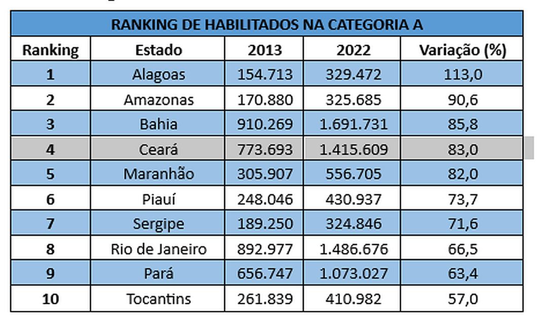 Según la entidad, 36,9 millones de personas cuentan hoy con la CNH, Licencia Nacional de Conducir, en la categoría A, específica para conducir motocicletas. En 2013, este contingente rondaba los 24,9 millones. Norte y Nordeste son los que tuvieron mayor evolución en el número de calificados. De los diez estados que registraron las mayores alzas, nueve forman parte de ambas regiones. En Alagoas, los CNH con categoría A más que se duplicaron y superaron los 329 mil. En Amazonas, el crecimiento fue del 90,6% (ver cuadro).