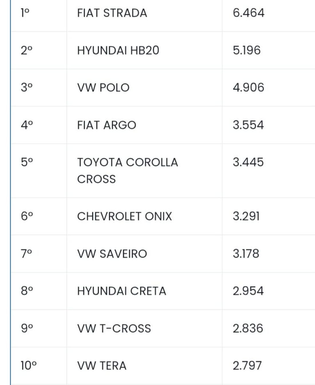 Considerando que hasta agosto Tera vendió 10,1 mil unidades, serían 40 mil en este último cuatrimestre, cerca de 10 mil/mes, volumen superior al registrado por el 3º y 4º clasificados en agosto, que fueron Toyota Corolla Cross y VW T-Cross, con 7,7 y 7 mil unidades, respectivamente.