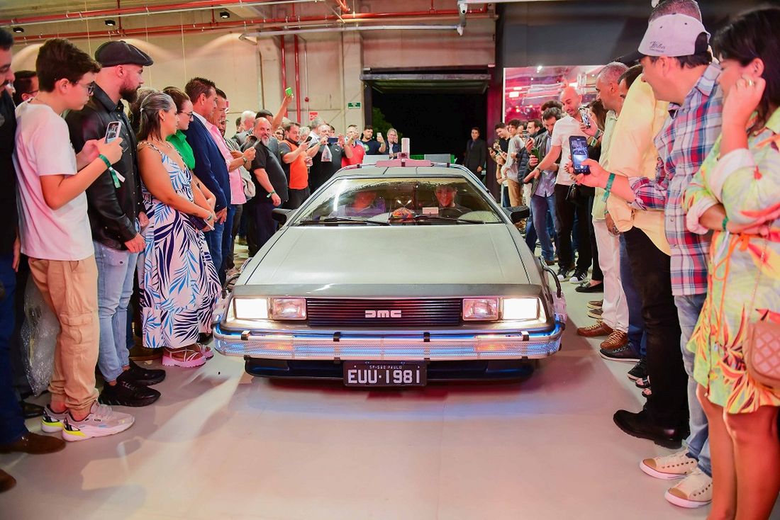 A continuación, un DeLorean DMC-12, que presentaba todas las características del modelo utilizado en la trilogía Regreso al futuro, incluido el condensador de flujo, sorprendió al rodar entre los invitados.