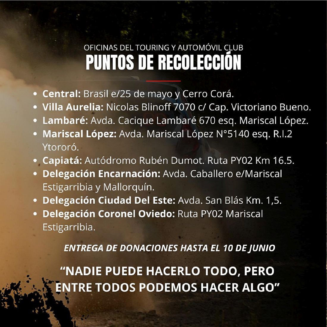“Teniendo en cuenta que la carrera la tenemos ahora durante ese clima invernal se ve la necesidad de brindar un apoyo a los hermanos indígenas de la zona. Paraguay Overland y la misma gente del Touring que ha recorrido los caminos pudo ver la necesidad de la gente de poseer indumentarias necesarias para afrontar estos momentos complicados que también se presentan críticos en la Región Occidental”, dijo el popular Caco, al hacer uso de la palabra tras una reunión con el presidente de la Comisión Deportiva de TACPy, Edgar Molas.