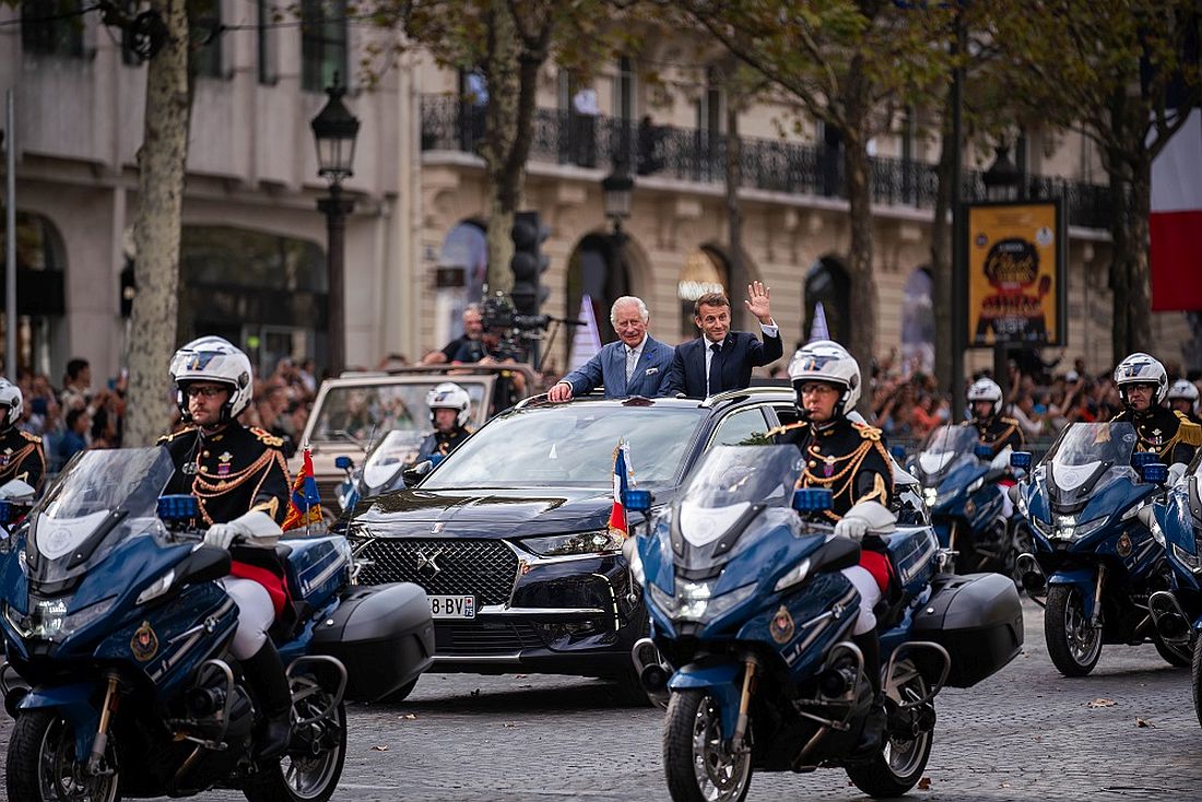 Recibidos frente al Arco del Triunfo, Sus Majestades el Rey Carlos III y la Reina Camilla fueron invitados al Palacio del Elíseo. El descenso de la emblemática Avenue des Champs-Elysées se realizó a bordo del DS 7.