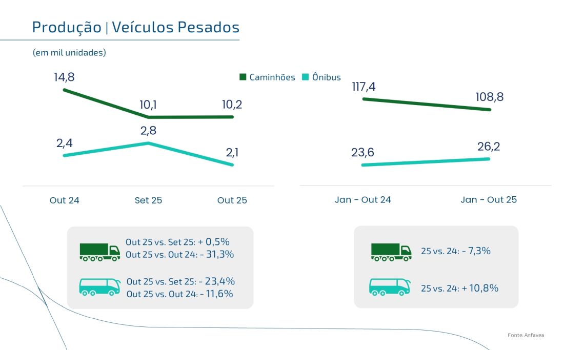 En octubre, la industria brasileña de camiones produjo 108.792 unidades, un volumen un 7,3% inferior al registrado hace un año, cuando las fábricas ensamblaron 117.403 unidades.