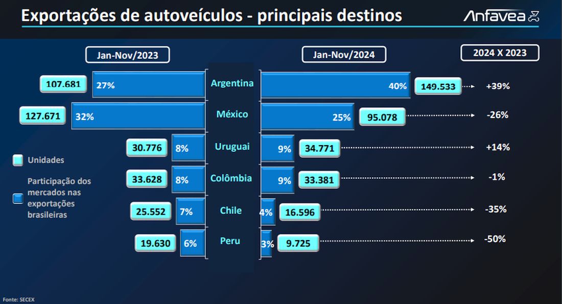 El presidente de Anfavea, sin embargo, llama la atención sobre la caída de la participación de los productos brasileños en los países de la región, incluido el aumento de las ventas. En Argentina es del 38,2%, en Colombia del 19%, en México del 7%, en Perú del 6,9% y en Chile del 6%.