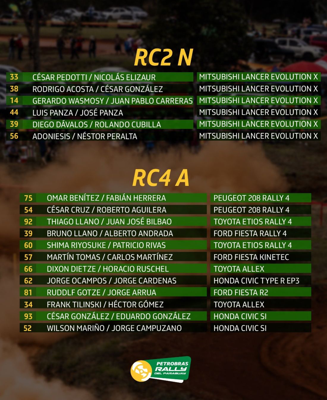 En la RC2N, en pilotos este es la actual situación de los puntos: César Pedotti 131, Gerardo Wasmosy 105 y Rodrigo Acosta 76. En copilotos: Marco Méndez 86, César González 82 y Nicolás Elizaur 76.