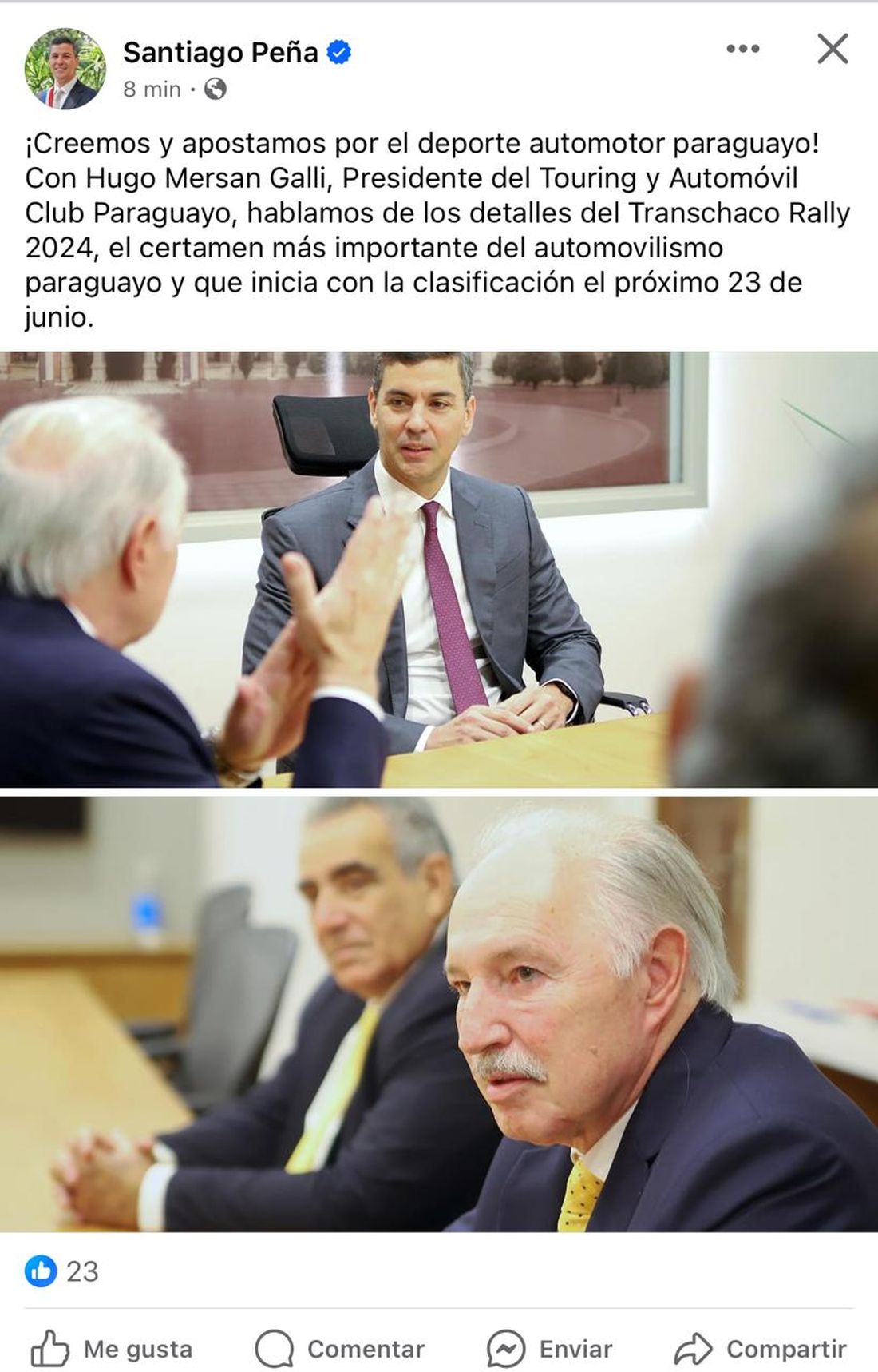 “¡Creemos y apostamos por el deporte automotor paraguayo!. Con Hugo Mersán Galli, presidente del Touring y Automóvil Club Paraguayo hablamos de los detalles del Transchaco Rally 2024, el certamen más importante del automovilismo paraguayo y que se inicia con las clasificación el próximo 23 de junio”, posteo al término de la audiencia la cuenta oficial de Instagram del titular del Poder Ejecutivo del país.