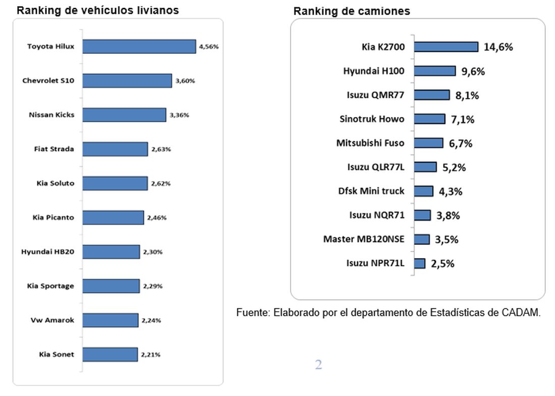 En cuanto a camiones, entre los modelos más importados se encuentran: Kia K2700 con el 14,6%, Hyundai H100 con 9,6%, Isuzu QMR77 con 8,1%, Sinotruk Howo con 7,1%, Mitsubishi Fuso con 6,7% y Isuzu QLR77L con 5,2%.