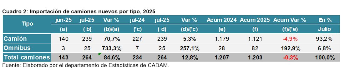 En el segmento de camiones y ómnibus, se importaron 264 unidades en julio, un 12,8 % más que julio de 2024. En el acumulado del año, los camiones alcanzaron 1.121 unidades, -4,9% a diferencia del año anterior. Mientras que, en el mismo periodo y con 82 unidades, los ómnibus alcanzaron 192,9%.