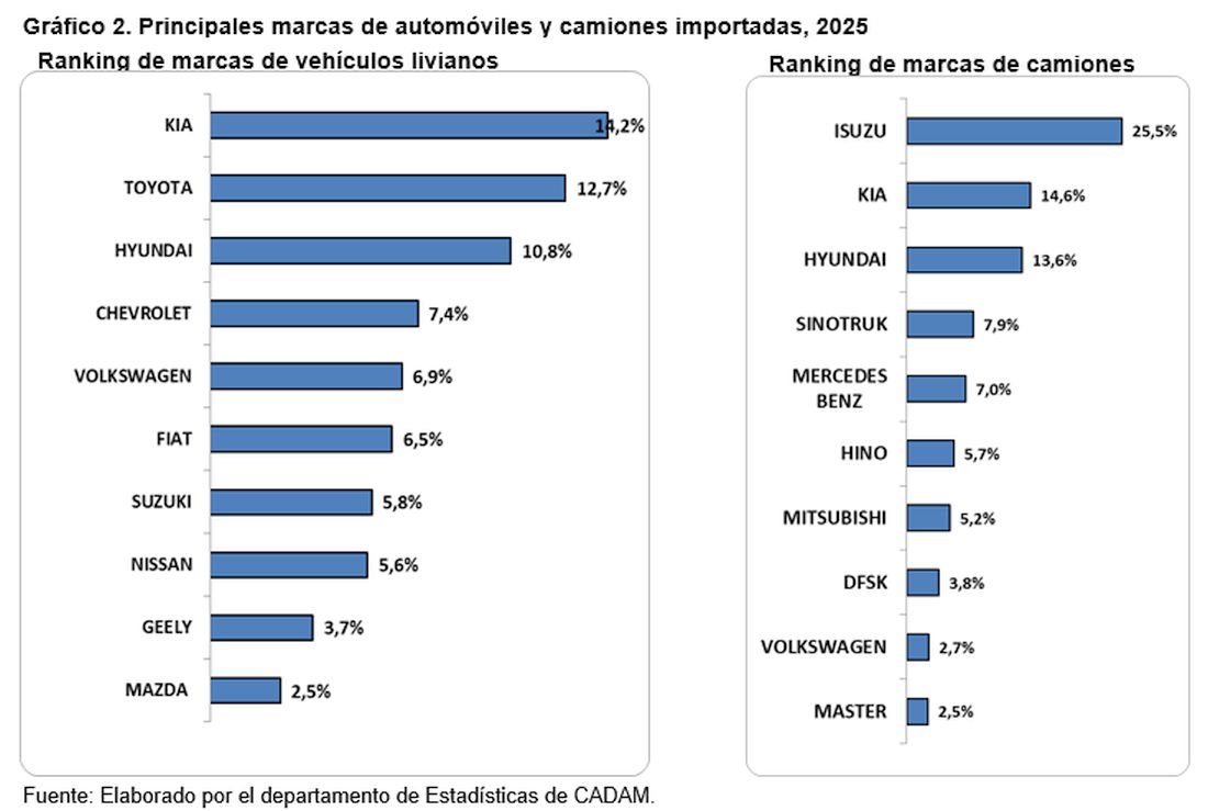 La importación de vehículos por marca está liderada por Kia con el 14,2 % del total, seguida por Toyota con el 12,7 %, Hyundai con el 10,8 %, Chevrolet con el 7,4 %, Fiat con el 7,3% y Volkswagen con 6,9 %.