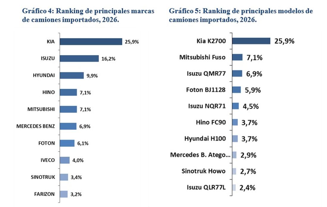 Por modelos, el Kia K2700 lidera con el 25,9%, seguido por Mitsubishi Fuso con el 7,1%, Isuzu QMR77 con el 6,9%, Foton BJ1128 con el 5,9%, Isuzu NQR71 con el 4,5%, Hino FC90 y Hyundai H100 con el 3,7%, Mercedes Benz Atego 1726/48 con el 2,9%, Sinotruk Howo con el 2,7% e Isuzu QLR77L con el 2,4%.