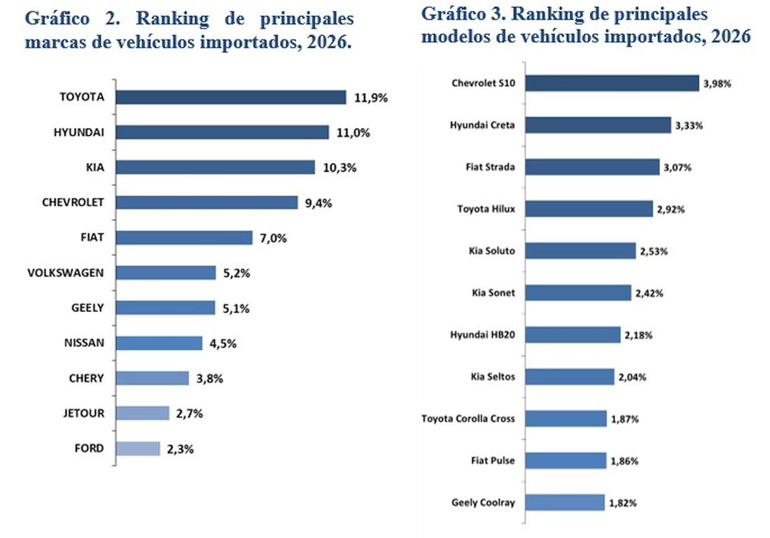 En el ranking de importaciones por marca en vehículos livianos, Toyota encabeza con el 11,9%, seguido por Hyundai con el 11,0%, Kia con el 10,3%, Chevrolet con el 9,4%, Fiat con el 7,0%, Volkswagen con el 5,2%, Geely con el 5,1%, Nissan con el 4,5%, Chery con el 3,8%, Jetour con el 2,7% y Ford con el 2,3%.