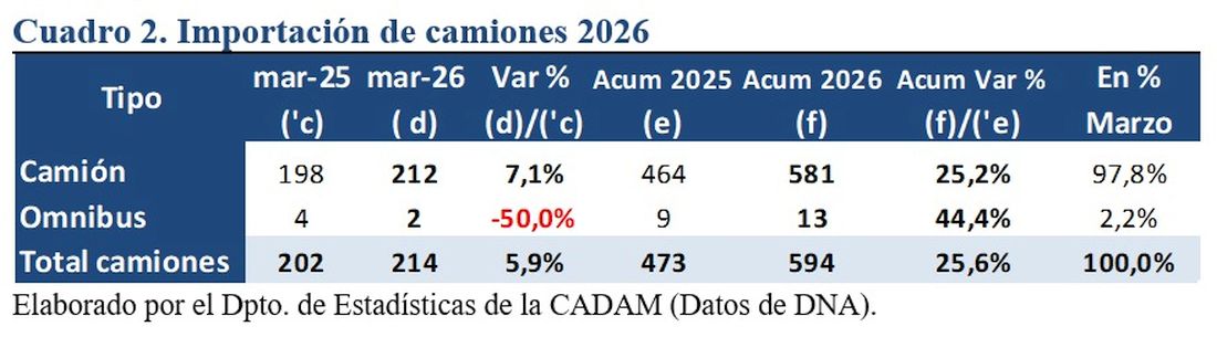 En cuanto a los vehículos pesados, las importaciones de camiones y ómnibus sumaron 594 unidades en el acumulado del año, con un crecimiento del 26,6%. Los camiones representaron el 97,8% del total con 581 unidades y un incremento del 25,2%, mientras que los ómnibus alcanzaron 13 unidades, con una participación del 2,2% y un crecimiento del 44,4%.