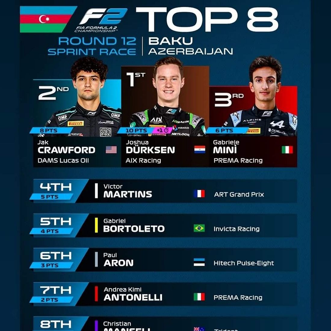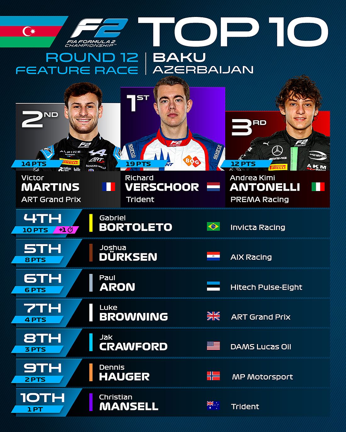 Con la distancia de carrera reducida, se repartieron 3 puntos, pero con el cuarto puesto y el punto por vuelta rápida, Gabriel Bortoleto se hizo con el liderato del Campeonato de Pilotos, ahora con 169,5 puntos. Isack Hadjar se mantiene en segundo lugar, pero no sumó puntos en Bakú, todavía con 165 puntos. Zane Maloney también se quedó sin puntos, pero se mantiene tercero con 135, mientras que Paul Aron se acerca en cuarto lugar, ahora con 133. Jak Crawford se mantiene quinto con 116 puntos, mientras que Andrea Kimi Antonelli también se acerca al grupo de delante, ahora con 113.