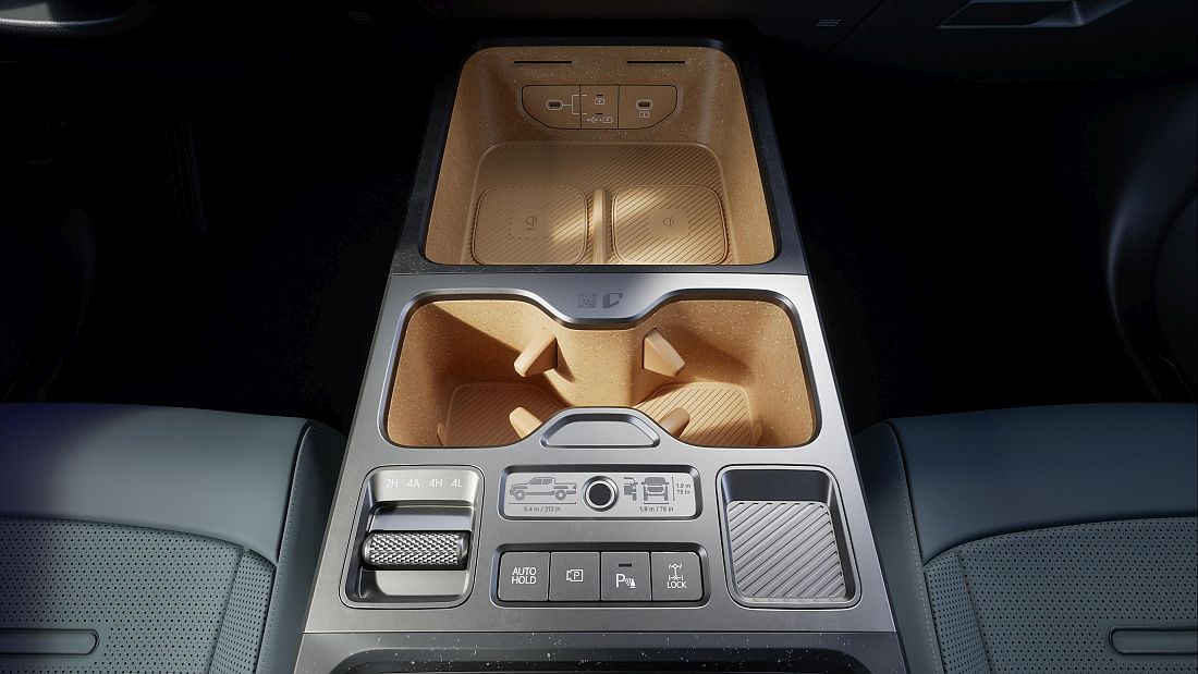 En el interior, la consola plegable añade más versatilidad al Kia Tasman, ya que permite que pase de ser un vehículo de trabajo a un espacio empresarial móvil. Esto ofrece a los usuarios la oportunidad de utilizar su ordenador portátil para trabajar o relajarse.