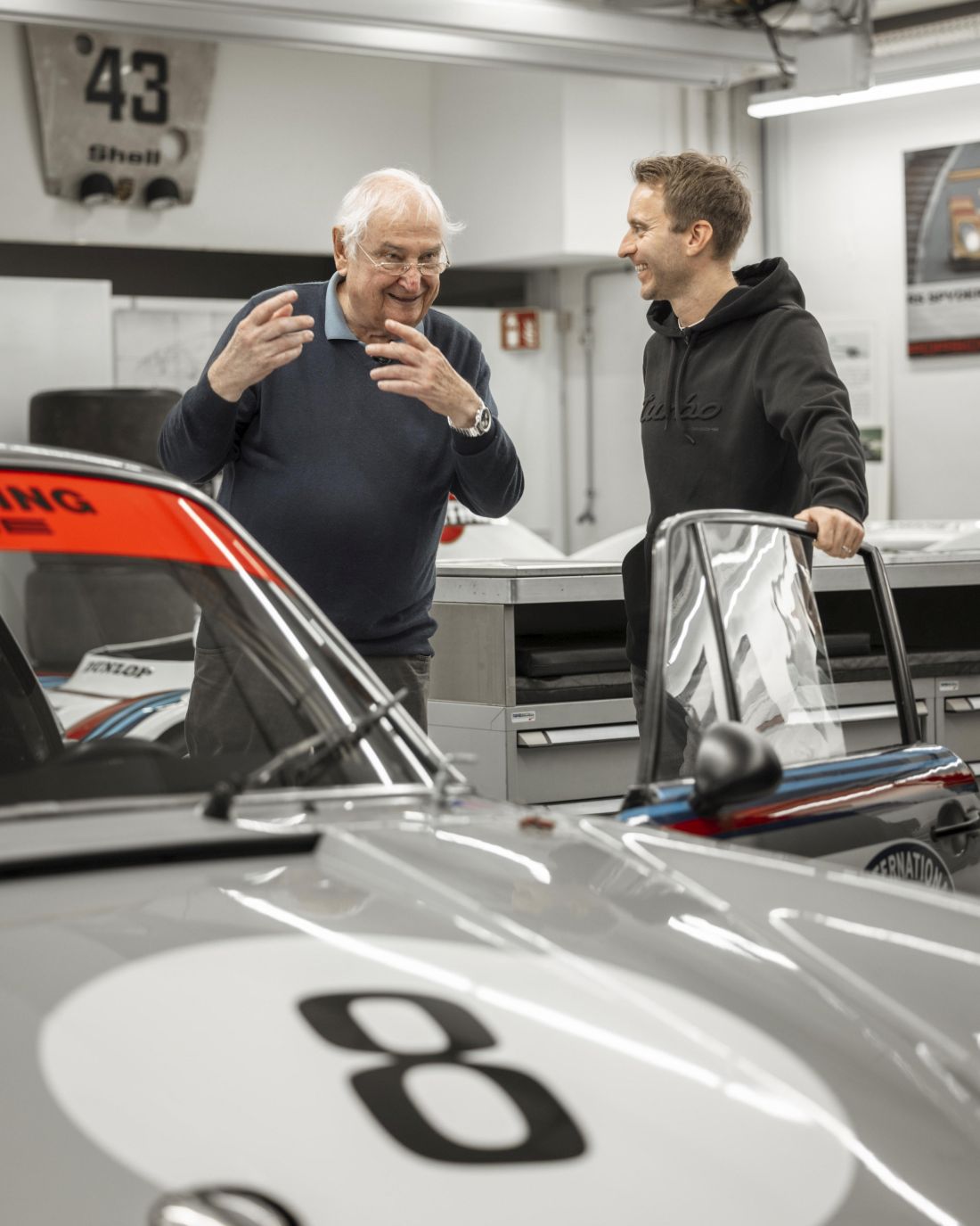 Timo Bernhard se reúne con otro miembro destacado de los primeros años del turbo en Porsche para el segundo episodio de “Porsche Heritage Moments”: Hermann Burst. En 1969, este hombre que hoy tiene 84 años empezó a trabajar como ingeniero aerodinámico en el departamento de Competición dirigido por Peter Falk. Más tarde desempeñó el cargo de Jefe del departamento de Desarrollo de Carrocerías. Junto con su equipo, se centró en mejorar la aerodinámica del 911 a principios de la década de 1970 y, entre sus primeros trabajos conocidos, destacó el alerón trasero del 911 Carrera RS 2.7, que rápidamente se ganó el apodo de “cola de pato”. Después de esto, Burst continuó trabajando en nuevas formas para el nueveonce, que debían integrarse armoniosamente pero a la vez ser inmediatamente reconocibles como una etapa evolutiva del 911 existente. En 1974, Porsche presentó el 911 Carrera RS 3.0. En la zaga lucía su característica “cola de pato”, un alerón trasero que más tarde se denominaría “cola de ballena” en el 911 Turbo.
