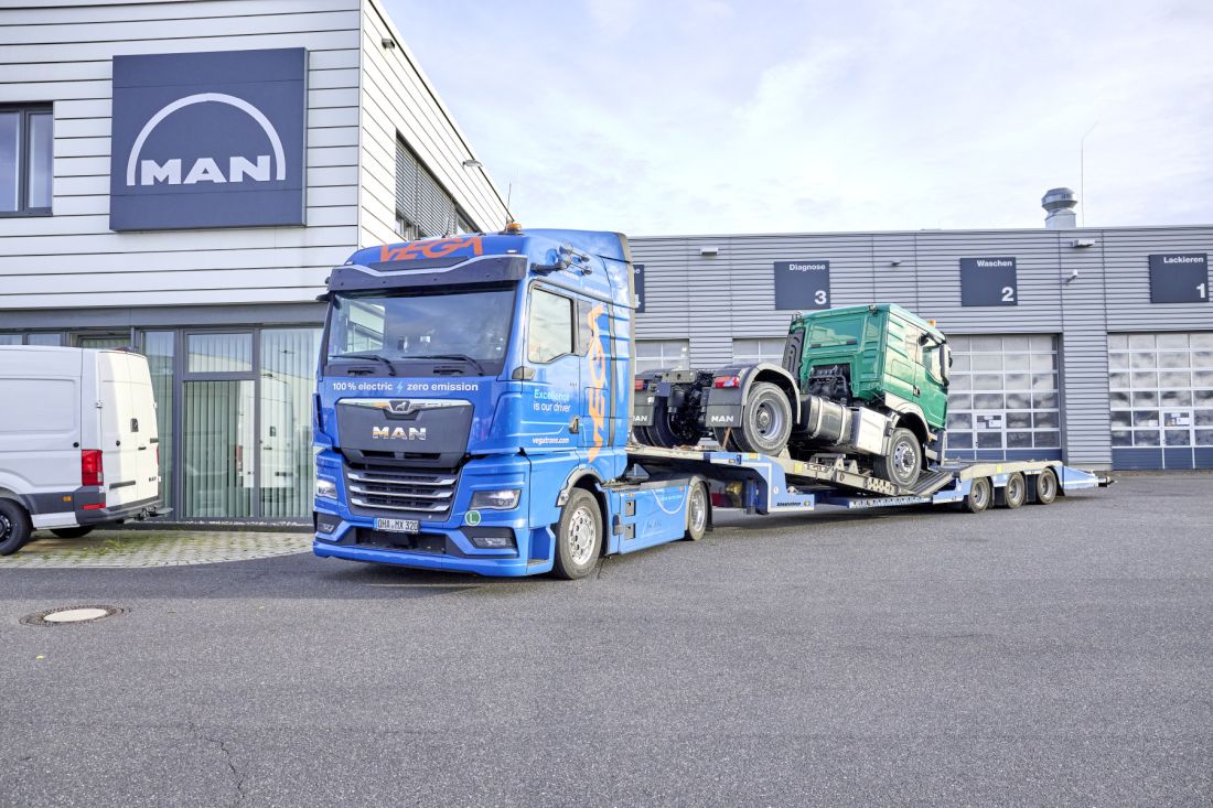 Cada semana, los camiones MAN eTGX entregan entre 30 y 40 camiones nuevos desde la terminal ferroviaria de VEGA en Rheine, cerca de Osnabrück, en un radio de 300 km, utilizando energía 100% eléctrica y, por lo tanto, sin emisiones locales. Los vehículos nuevos se transportan desde la planta de producción de MAN en Cracovia (Polonia), por lo que la mayor parte de la ruta también se cubre eléctricamente por ferrocarril. El transporte ferroviario al noroeste de Alemania forma parte del servicio LionXpress. El concepto de transporte se basa en dos rutas ferroviarias a Alemania y Austria, que MAN está ampliando gradualmente con sus socios logísticos. Esto ya permite a MAN lograr importantes ahorros de CO₂. Desde el inicio del proyecto en junio de 2023, VEGA ha transportado más de 11 000 camiones por tren de forma más respetuosa con el medio ambiente, ahorrando 6000 toneladas de CO₂. En total, los dos conceptos de tren LionXpress han ahorrado alrededor de 10 400 toneladas de CO₂ en el transporte de más de 22 000 camiones. El concepto de carga patentado de VEGA también permite cargar camiones de hasta 4,2 metros de altura en trenes. El uso de camiones eléctricos para la entrega de vehículos nuevos electrifica toda la cadena logística, desde la planta de producción hasta el cliente final.