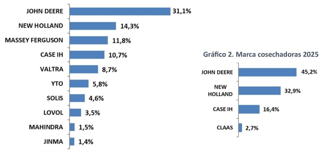 John Deere lidera con el 31,1% la importación de tractores, le siguen New Holland con 14,3%, Massey Ferguson con 11,8%, Case IH con 10,7%, Valtra con 8,7%, YTO con 5,8% y Solis con 4,6%, Lovol con 3,5%, Mahindra con 1,5% y Jinma con 1,4%.