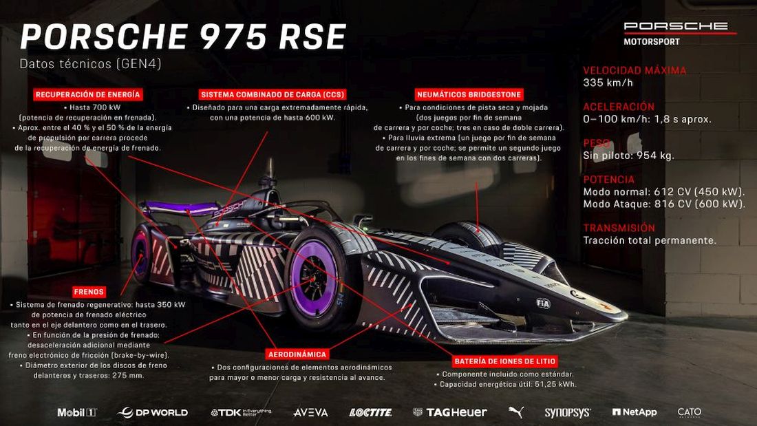 El Porsche 975 RSE es el sucesor del actual Porsche 99X Electric. El fórmula más exitoso de Porsche hasta hoy ha ganado cuatro títulos mundiales en las últimas tres temporadas. Disputará su última prueba en agosto, en el final de temporada en Londres, donde Porsche aspira a luchar por nuevos títulos. Se espera que el 975 RSE haga su debut en competición en diciembre. Su nombre hace referencia al 75º aniversario de Porsche Motorsport -que se celebra en 2026-, una historia de éxito que en el futuro estará cada vez más marcada por el automovilismo eléctrico.
