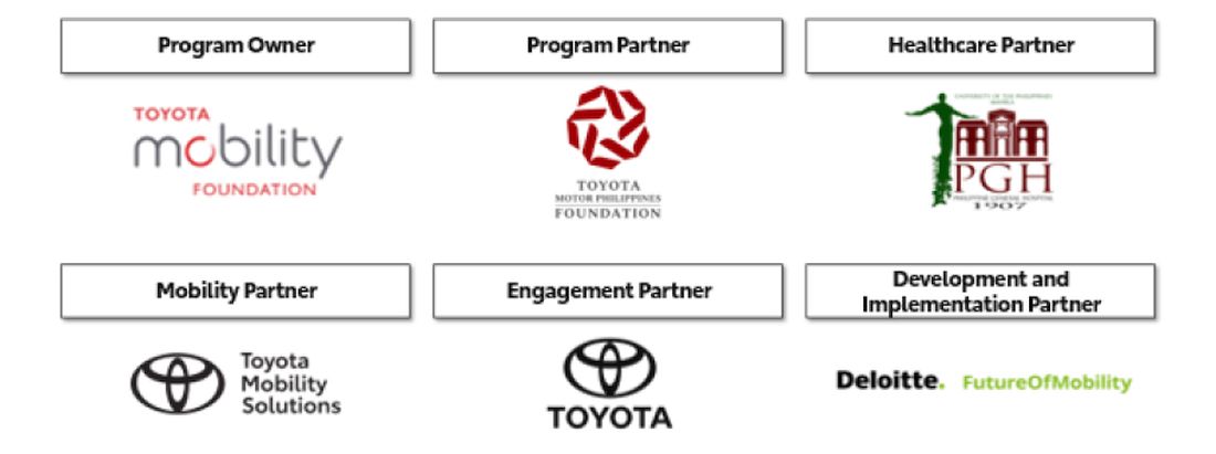 El programa está impulsado por una sólida colaboración con Toyota Mobility Solutions Philippines (TMSPH) como socio de movilidad, con el apoyo de Toyota Motor Philippines Corporation (TMP) como socio participante y el Deloitte Future of Mobility Solution Centre como socio de desarrollo e implementación.