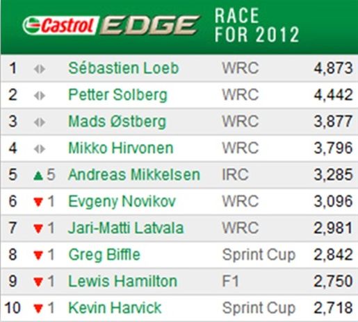 El WRC domina la Castrol EDGE Race for 2012, que se debe tanto al calendario de temporada (el WRC ya ha celebrado cuatro de sus 13 eventos) como al rendimiento de los pilotos. Mientras que sencillamente la frecuencia de la Copa Sprint de NASCAR presentará a Carl Edwards, Tony Stewart y Greg Biffle como posibles pretendientes al trono de Sebastien Loeb. En realidad, lo más posible es que sea la Fórmula 1 la que presente el mayor reto, que entre el 15 y el 22 de abril visita China y Bahrain en fines de semana consecutivos. A partir de las dos primeras carreras, Lewis Hamilton cuenta con 2750 puntos -más de la mitad de los que tiene Loeb. Con otras dos carreras que sumar al total, es posible que Hamilton adelante a Loeb al finalizar la carrera en Bahrain. Del mismo modo podrían hacerlo Jenson Button y Fernando Alonso.