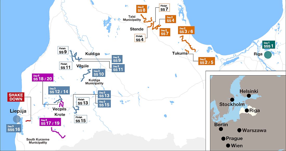 El parque de asistencia se encuentra en la ciudad costera de Liepāja, al sur del país, pero la capital, Riga, acogerá el inicio del rally el jueves por la noche, con una superespecial inaugural que tendrá lugar en el cercano complejo del circuito de Biķernieki. La ruta del viernes es la más larga del rally, con 120,92 kilómetros competitivos, y lleva a las tripulaciones al noroeste de Riga sin asistencia al mediodía, solo zonas de montaje de neumáticos antes de los bucles de la mañana y la tarde. Algunas de las especiales se corren una sola vez, como es el caso también del sábado, donde la acción se desarrolla más cerca de Liepāja y está separada por la asistencia del mediodía. Un par de especiales que se corren dos veces completan el evento el domingo.