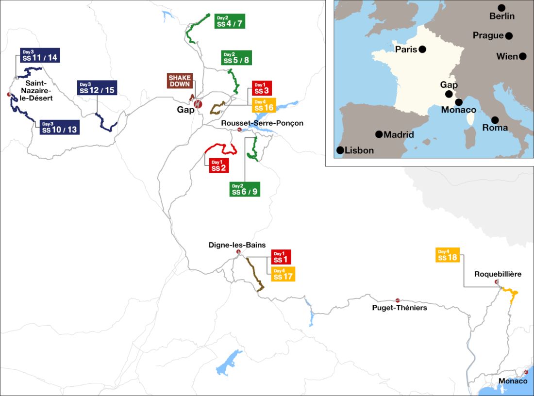 El Rally de Montecarlo, conocido por sus condiciones meteorológicas cambiantes que pueden provocar hielo y nieve en las carreteras asfaltadas, comenzará y terminará como de costumbre en la plaza del Casino de Mónaco. Partiendo el jueves por la tarde, las tripulaciones afrontarán tres especiales iniciales en la oscuridad de camino al parque de asistencia de Gap. El viernes, se correrá un bucle de tres especiales al este y al norte de Gap a ambos lados de la asistencia de mediodía. El sábado seguirá un formato similar con tres especiales repetidas hacia el oeste, incluida la nueva especial Aucelon – Recoubeau-Jansac. La última etapa del domingo comenzará en Gap, repitiendo dos de las especiales del jueves por la noche antes de la Power Stage, que pasa por el icónico Col de Turini.