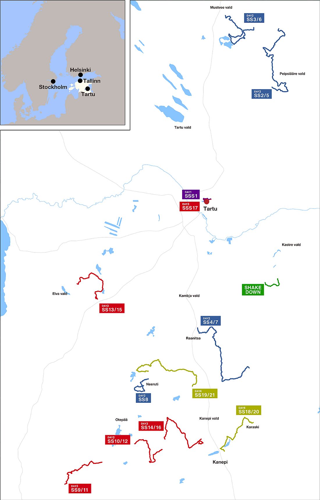 El viernes es el día más largo del rally con 133,38 kilómetros de carrera: los tramos familiares de Peipsiääre y Mustvee al norte y Raanitsa al sur se corren dos veces a cada lado del servicio del mediodía, antes de que un solo pase de Neeruti complete el día. El formato del sábado es diferente, con dos etapas disputadas dos veces por la mañana antes de la asistencia y otro par de pruebas repetidas por la tarde. La súper especial de Tartu se vuelve a visitar al regresar al servicio por la noche. El final del domingo se compone de dos carreras en el tramo de Karaski, en su mayoría nuevo, y una versión extendida de Kambja, que nuevamente alberga el Power Stage que finaliza el rally.