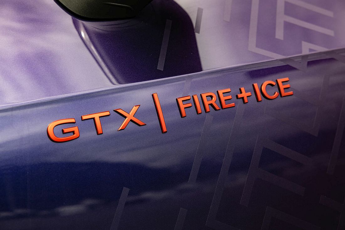 El ID.3 GTX FIRE+ICE destaca sobre todo por su exclusiva pintura de tres capas con efecto perlado. El color de efecto perlado Electric Violet se ha desarrollado especialmente para este modelo único y es una reinterpretación de la pintura exterior Fire and Ice del Golf Mk2. Además de la capa base azul oscuro, la pintura de tres capas contiene perlas de vidrio especiales que crean un efecto cromático especial y un carácter extraordinario. En función de la incidencia de la luz, el color cambia de azul oscuro a violeta o incluso negro. La moldura del marco del techo añade un acento deportivo con la potente pintura anodizada roja Flaming Red. Los laterales del vehículo están dominados por el estampado geométrico FIRE+ICE en transparente mate. Otra característica especial son las llantas de 21 pulgadas, que enfatizan el aspecto dinámico con una pintura anodizada azul con un toque brillante. El logotipo original de FIRE+ICE de los años 90 adorna el pilar B y el alerón del borde del techo.