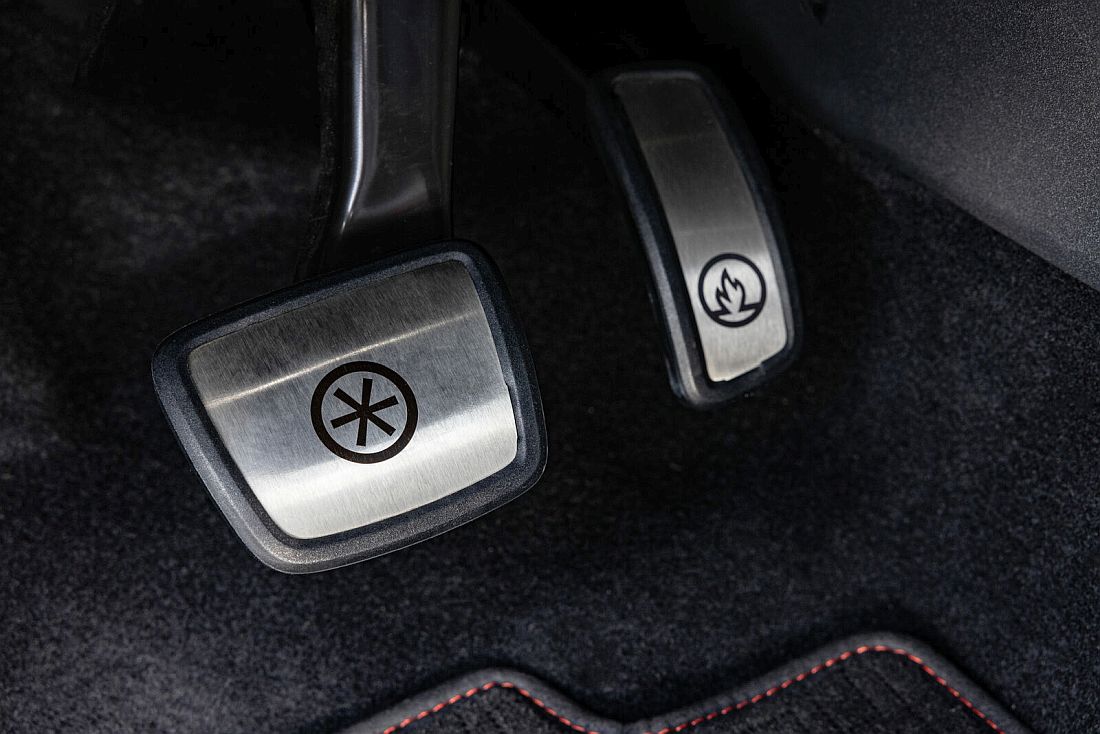 El interior está dividido en dos colores. Mientras que el color de acento Flaming Red (rojo llameante) para «FIRE» predomina en los asientos y las costuras del lado del conductor y del asiento trasero, los asientos y el interior del lado del pasajero se caracterizan por elementos de diseño en azul hielo («ICE»). Los pedales del acelerador de acero inoxidable tienen un diseño especial «FIRE+ICE» en lugar del diseño Play/Pause conocido de la familia ID. Acelere con el logotipo «FIRE» y frene pisando el logotipo «ICE». La parte superior del tablero de instrumentos y las alfombrillas también se han personalizado con un patrón «FIRE+ICE» grabado con láser. Inspirados en las colecciones BOGNER FIRE+ICE, se han utilizado numerosos colores, tejidos y elementos. Los asientos están acolchados y reflejan el diseño de las actuales chaquetas de plumón FIRE+ICE, incluidas las icónicas cremalleras B. Si se abren en los asientos, aparece debajo el tejido FIRE+ICE original de los años 90. Detrás de los asientos delanteros también se utilizaron correas de bolsos de la colección FIRE+ICE.