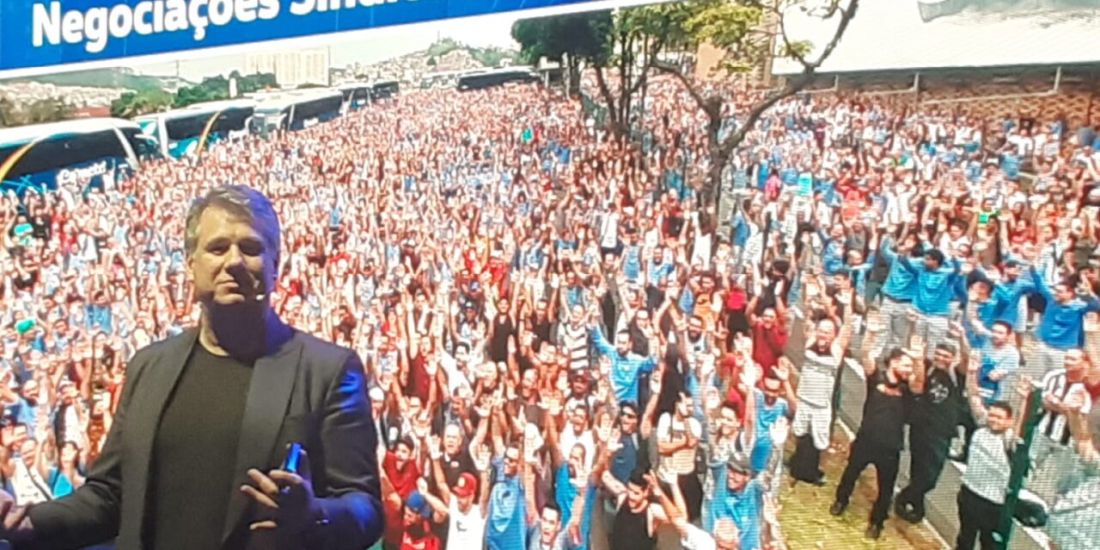 Con una diapositiva, de fondo, de metalúrgicos aprobando nuevos proyectos para la planta de ABC en São Paulo, Podemosbom citó indirectamente al general Motos al resaltar que “a diferencia de otras empresas que enfrentan huelgas, nosotros estamos avanzando, cerrando acuerdos hasta 2028”.